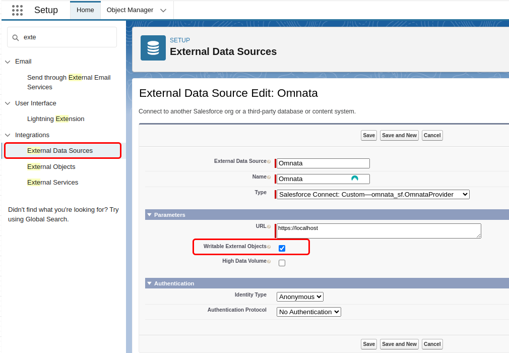 1. Edit the "Omnata" External Data Source and check the "Writable External Objects" box:
