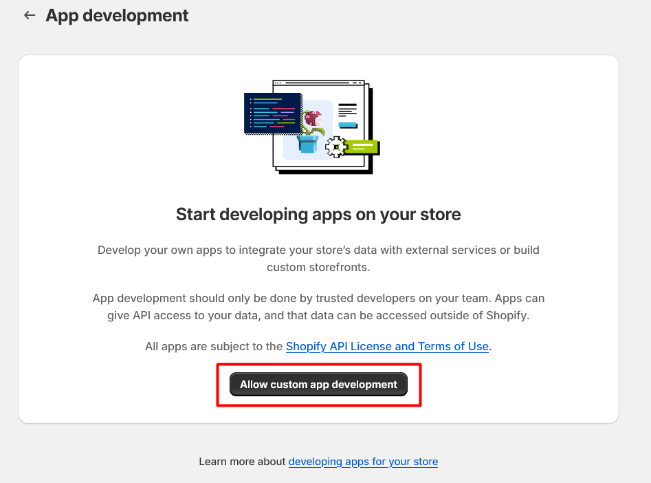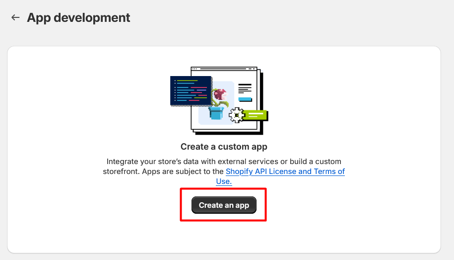 6. After activating custom app development, click on **Create an app**.